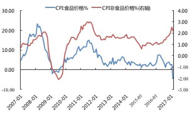 中國(guó)歷次通貨膨脹走高,在數(shù)據(jù)上都體現(xiàn)為食品價(jià)格帶動(dòng)。例如,上圖顯示,2009年年初食品價(jià)格同比增速?gòu)?/span>0%附近起步,到2011年年中升高到15%左右,帶動(dòng)CPI增速升至6.45%高位。而這一次,CPI從2016年下半年低位爬升,到2017年升至2.55%,食品價(jià)格升幅卻反向波動(dòng),更在2017年2月跌入負(fù)增長(zhǎng)(-4.3%),創(chuàng)出1989年以來(lái)的新低。
